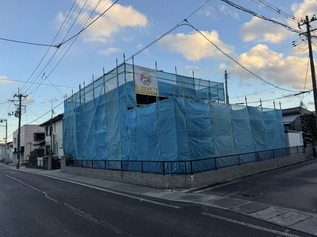 多賀城市A様邸を塗装工事中です。高圧洗浄の作業では、屋根に1日、外壁と付帯部に1日、門・塀・物置に半日と、合計2日半をかけて長年の汚れをしっかりと洗い流しました。この洗浄を丁寧に行うことが、塗料をしっかり密着させて長持ちさせるためにとても大切です。工事は天候を見ながら安全に進めて参ります。近隣の皆様、よろしくお願いいたします。