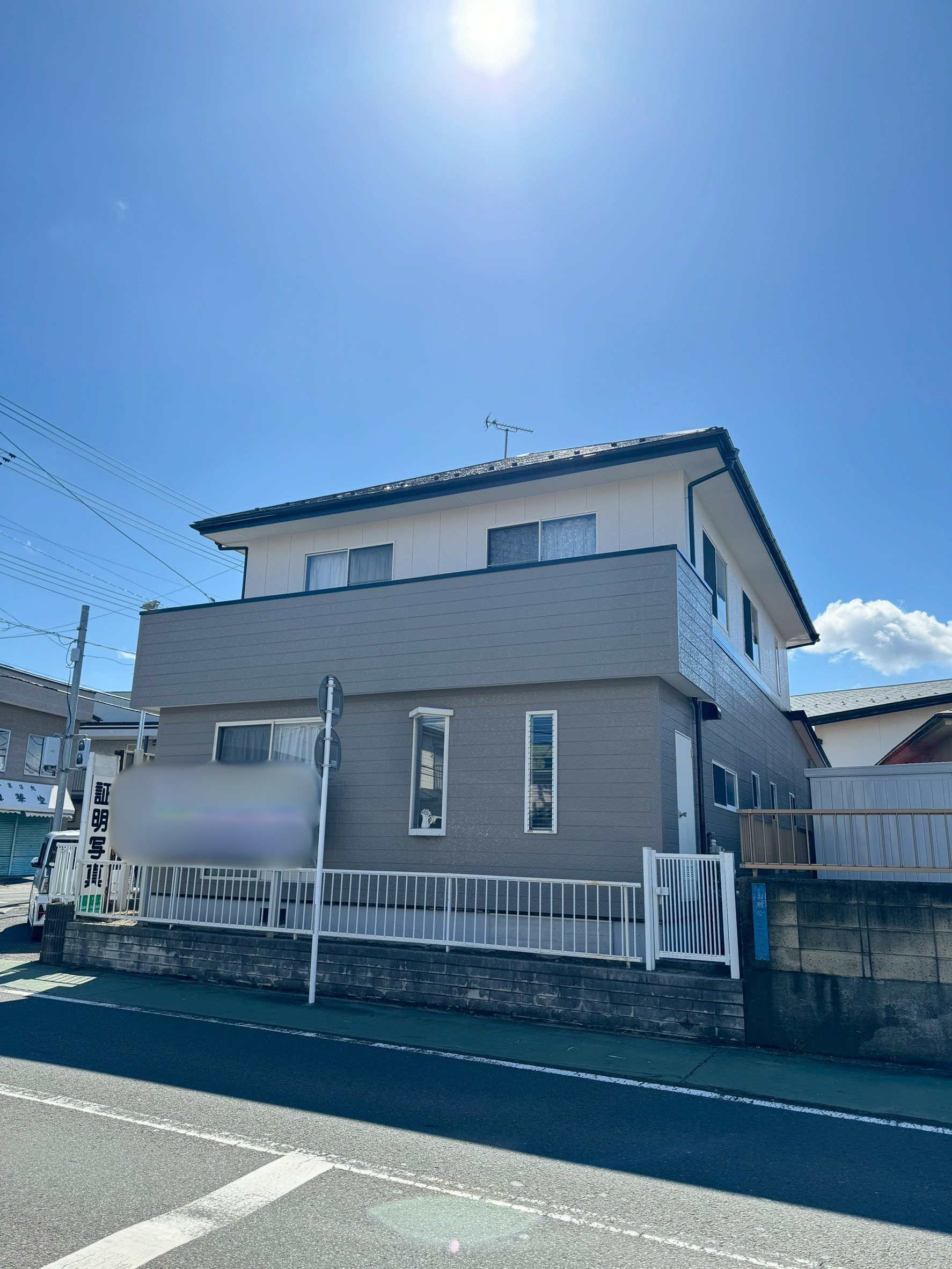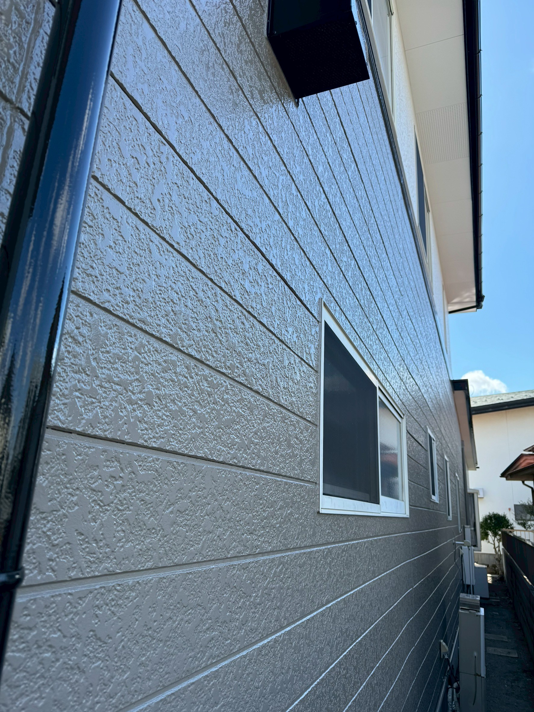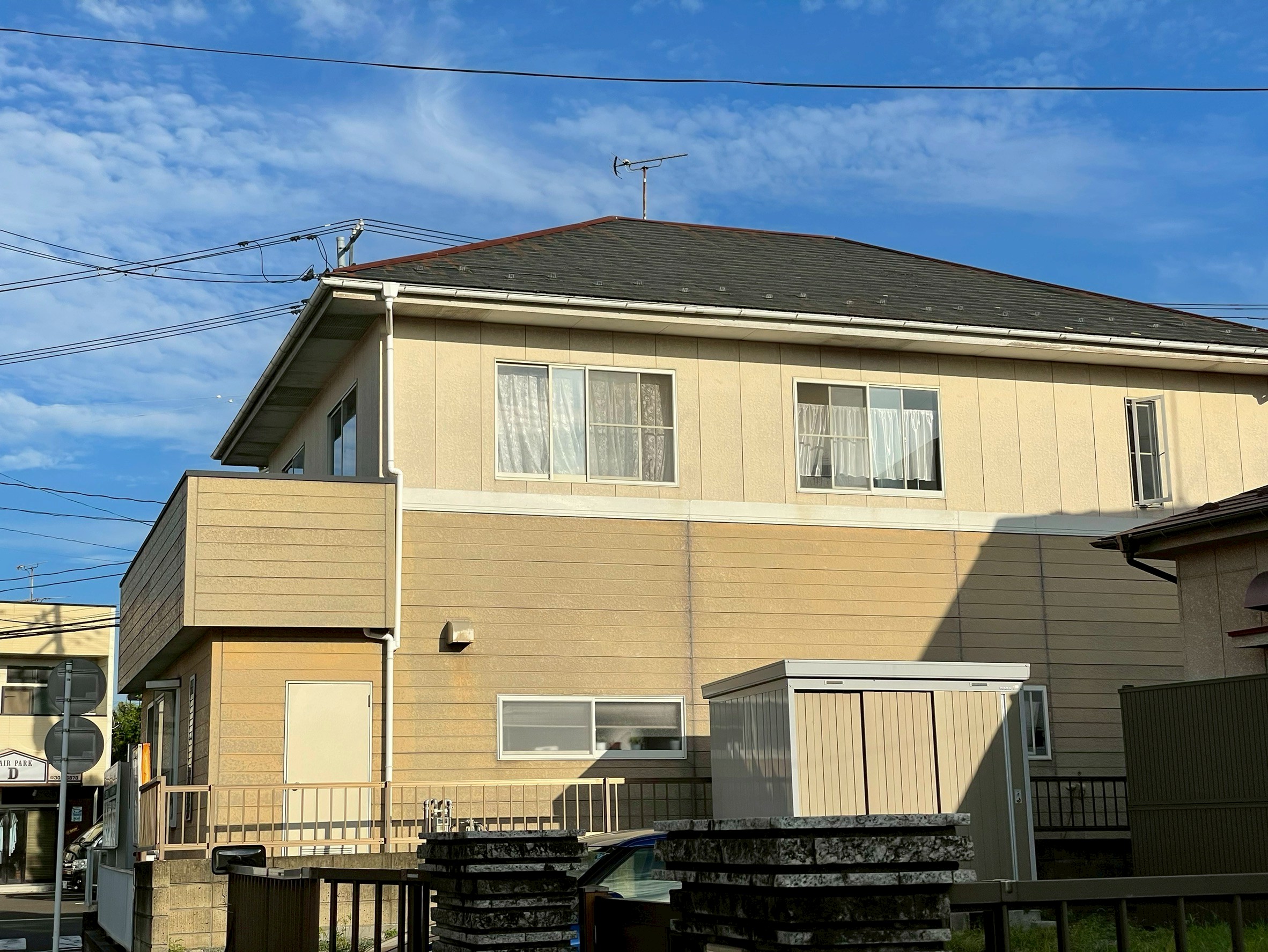 | 塗料(色) | 屋根:シリコン塗料・ファインルーフSi(コーヒーブラウン) 外壁:ラジカル塗料・パーフェクトトップsi(1F:ND-375、2F:ND-371) 破風板:シリコン塗料・ファインルーフSi(ブラック) 雨樋:シリコン塗料・ファインルーフSi(ブラック) 帯板:シリコン塗料・ファインルーフSi(コーヒーブラウン) 水切り:シリコン塗料・ファインルーフSi(コーヒーブラウン) 軒天:ケンエースG-II(N-90) 基礎:キソエース(PN-75) |
