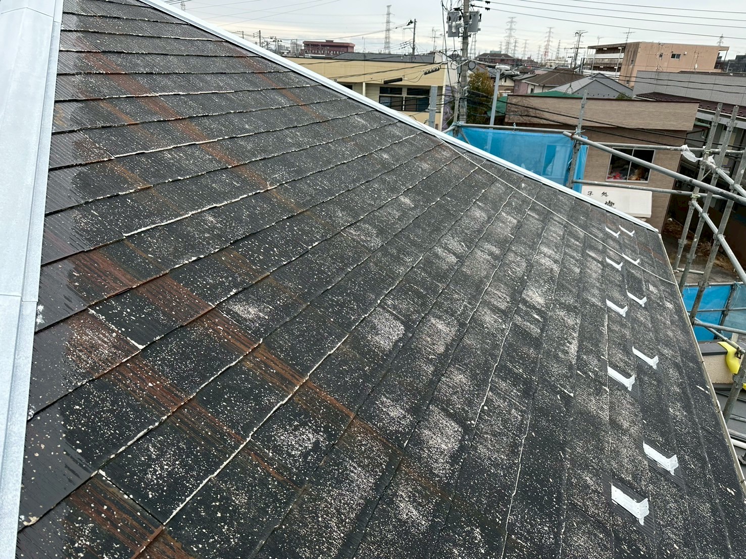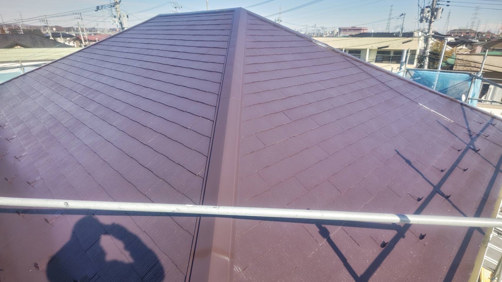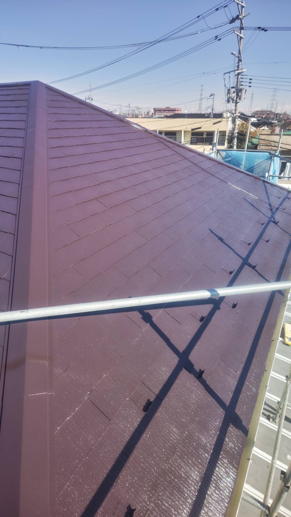 | 塗料(色) | 屋根:シリコン塗料・ファインルーフSi(コーヒーブラウン) 外壁:ラジカル塗料・パーフェクトトップsi(1F:ND-375、2F:ND-371) 破風板:シリコン塗料・ファインルーフSi(ブラック) 雨樋:シリコン塗料・ファインルーフSi(ブラック) 帯板:シリコン塗料・ファインルーフSi(コーヒーブラウン) 水切り:シリコン塗料・ファインルーフSi(コーヒーブラウン) 軒天:ケンエースG-II(N-90) 基礎:キソエース(PN-75) |