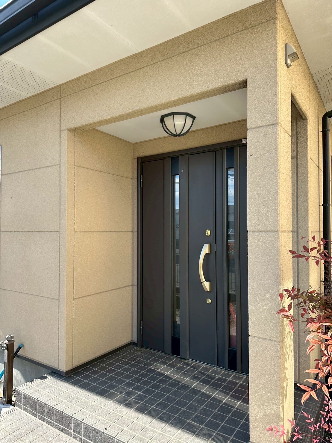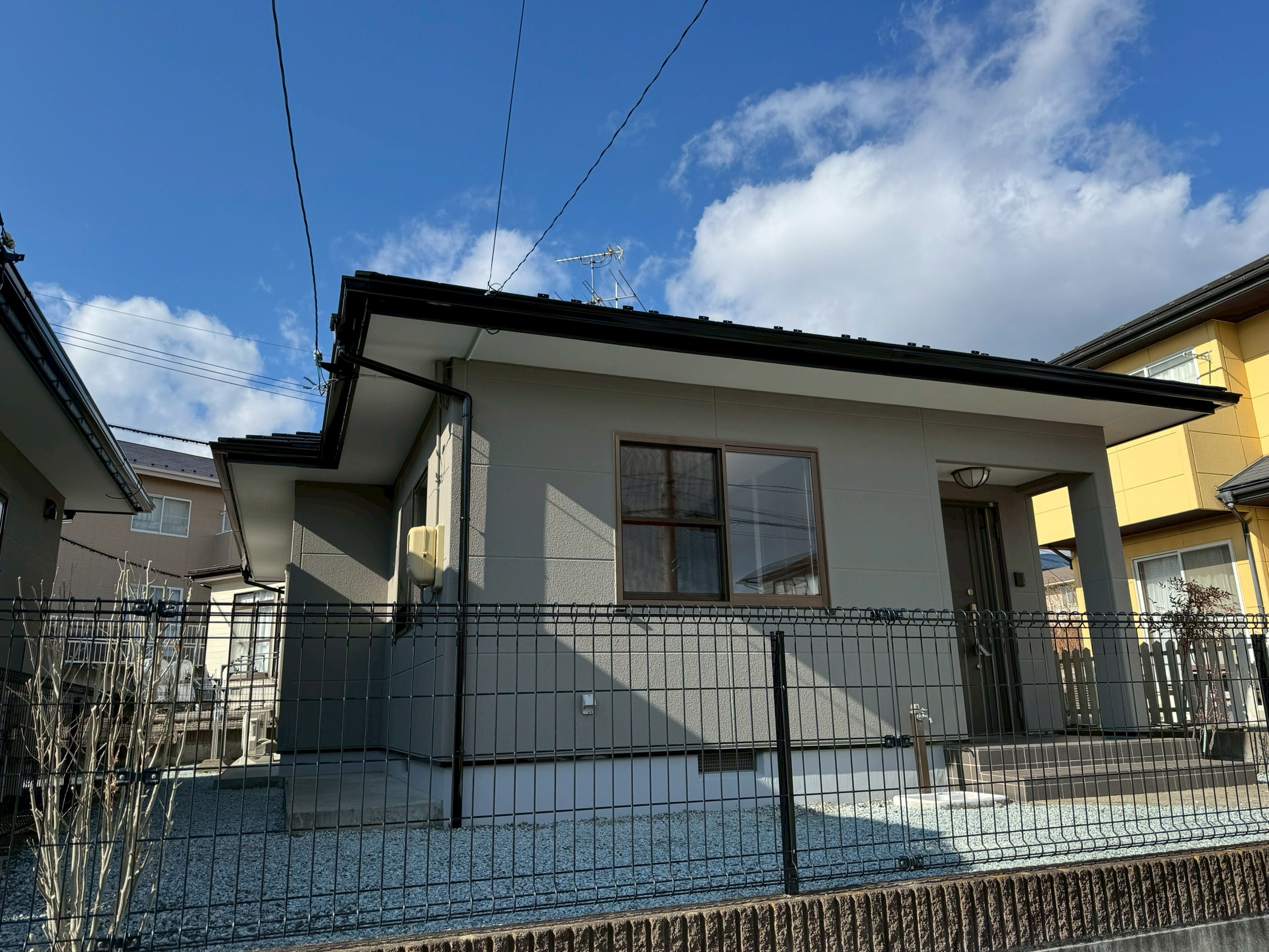 | 塗料(色) | 屋根:シリコン塗料・ファインルーフsi (ブラック)、下塗りはファインパーフェクトベスト強化シーラー 外壁:シリコン塗料・インディフレッシュセラ(IF9307)、下塗りは水性カチオンシーラー 破風板:シリコン塗料・ファインルーフsi(ブラック) 雨樋:シリコン塗料・ファインルーフsi(ブラック) 軒天:ケンエースG-II(N-90) 基礎:キソエース(N-75) |