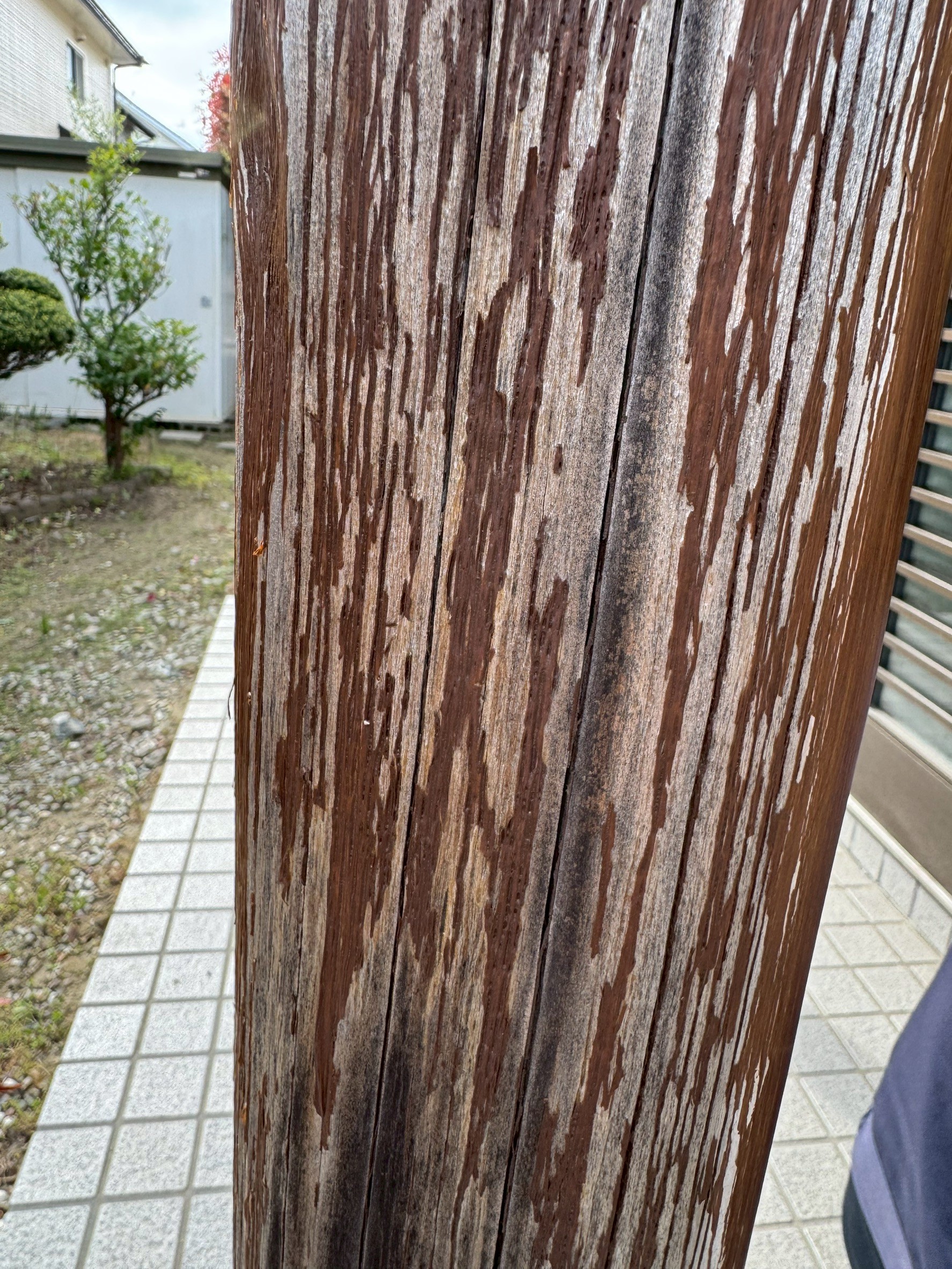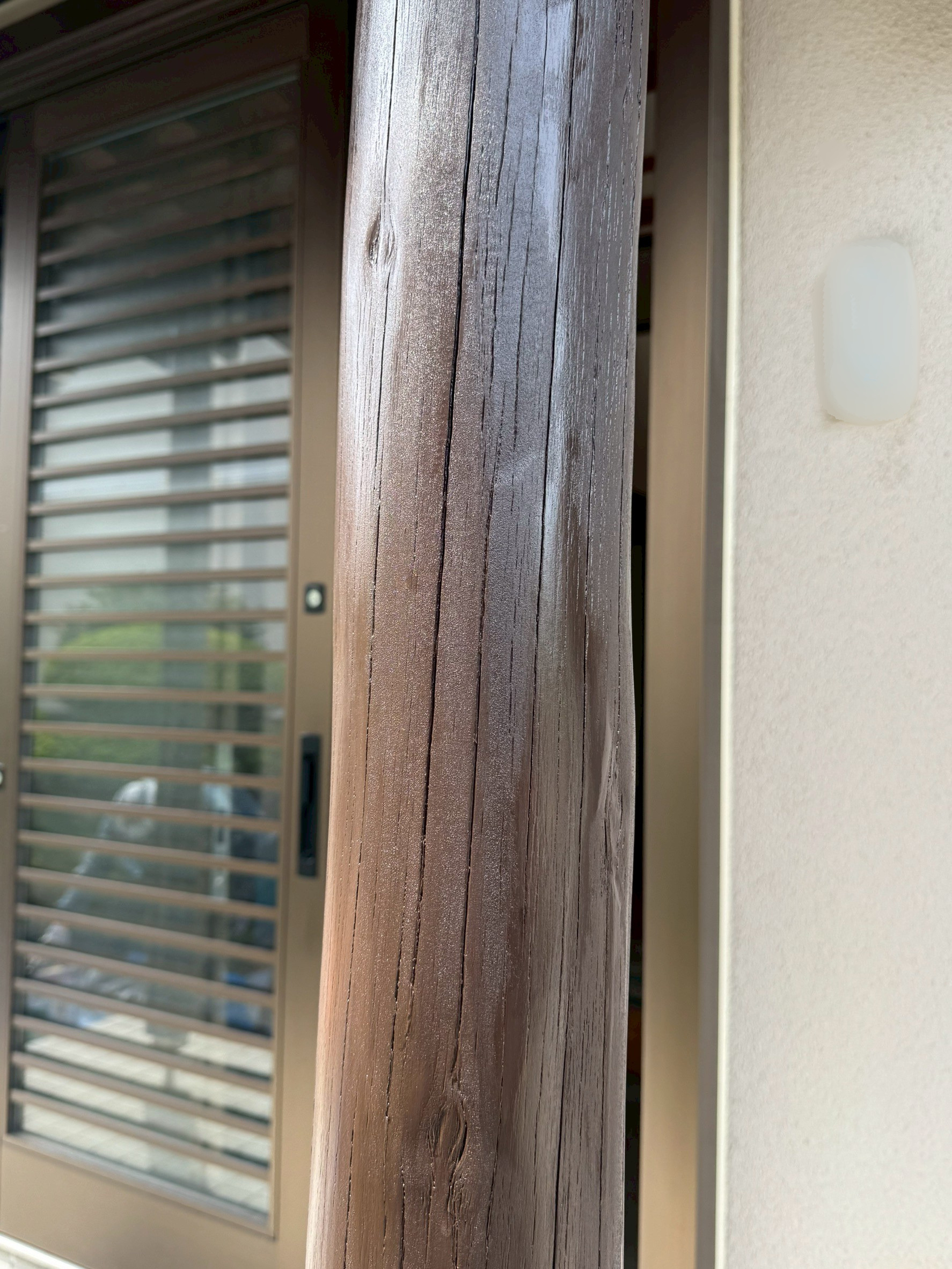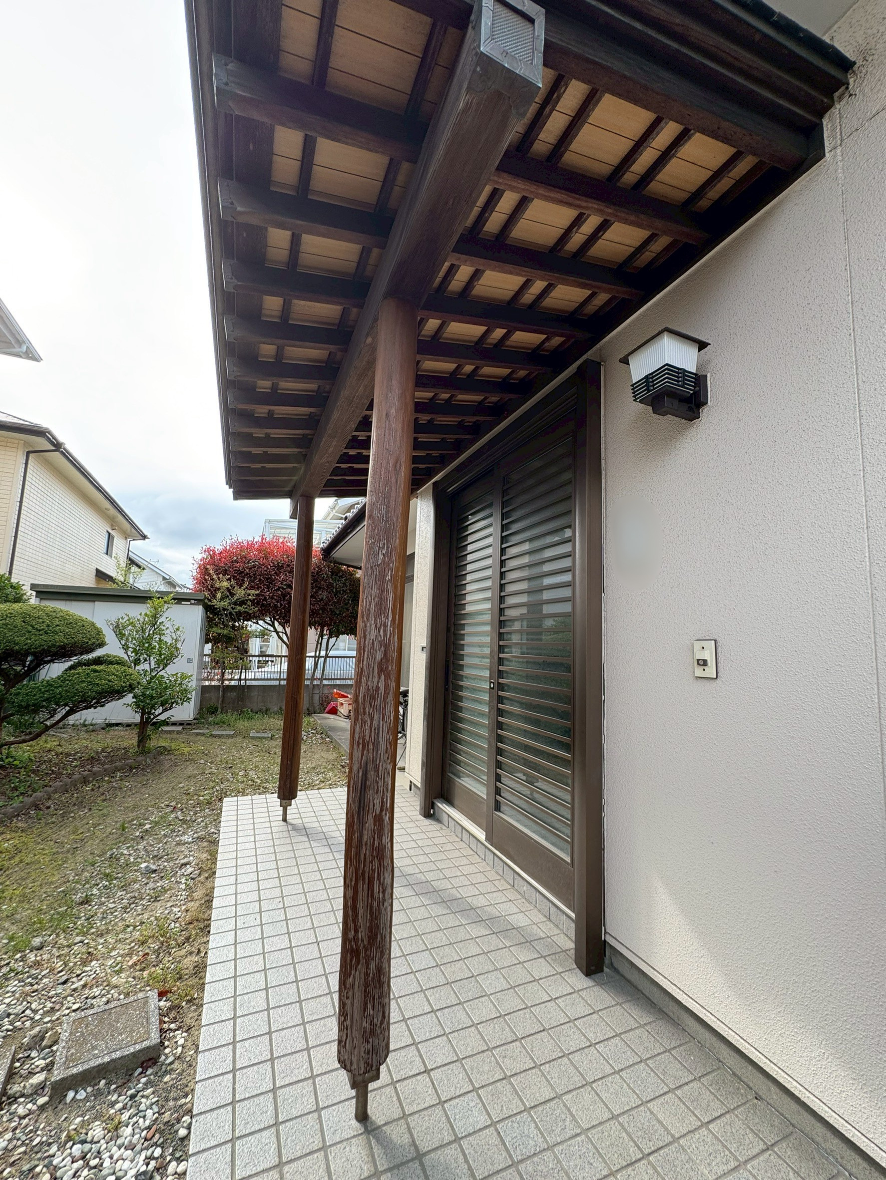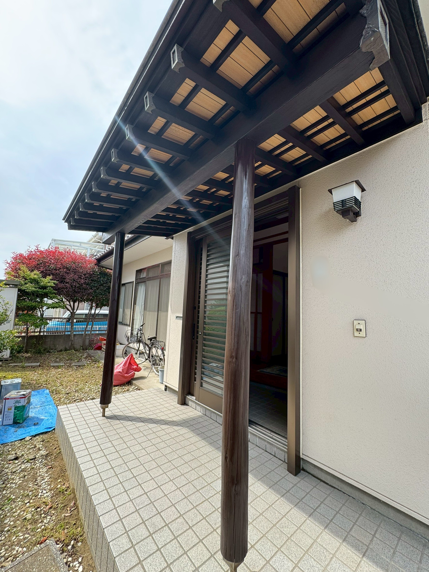 今回施工させていただいた玄関周りの木部ですが、以前から不具合でお困りだったそうですね。施工業者さんになかなか対応してもらえず、大変な思いをされた中で当店にご相談いただいたこと、とても光栄に思います。今回は、防腐・防カビ・防虫効果がしっかり備わった木材保護塗料「ノンロット」(前田工繊産資)を使用し、木の風合いを活かして綺麗に仕上げさせていただきました。