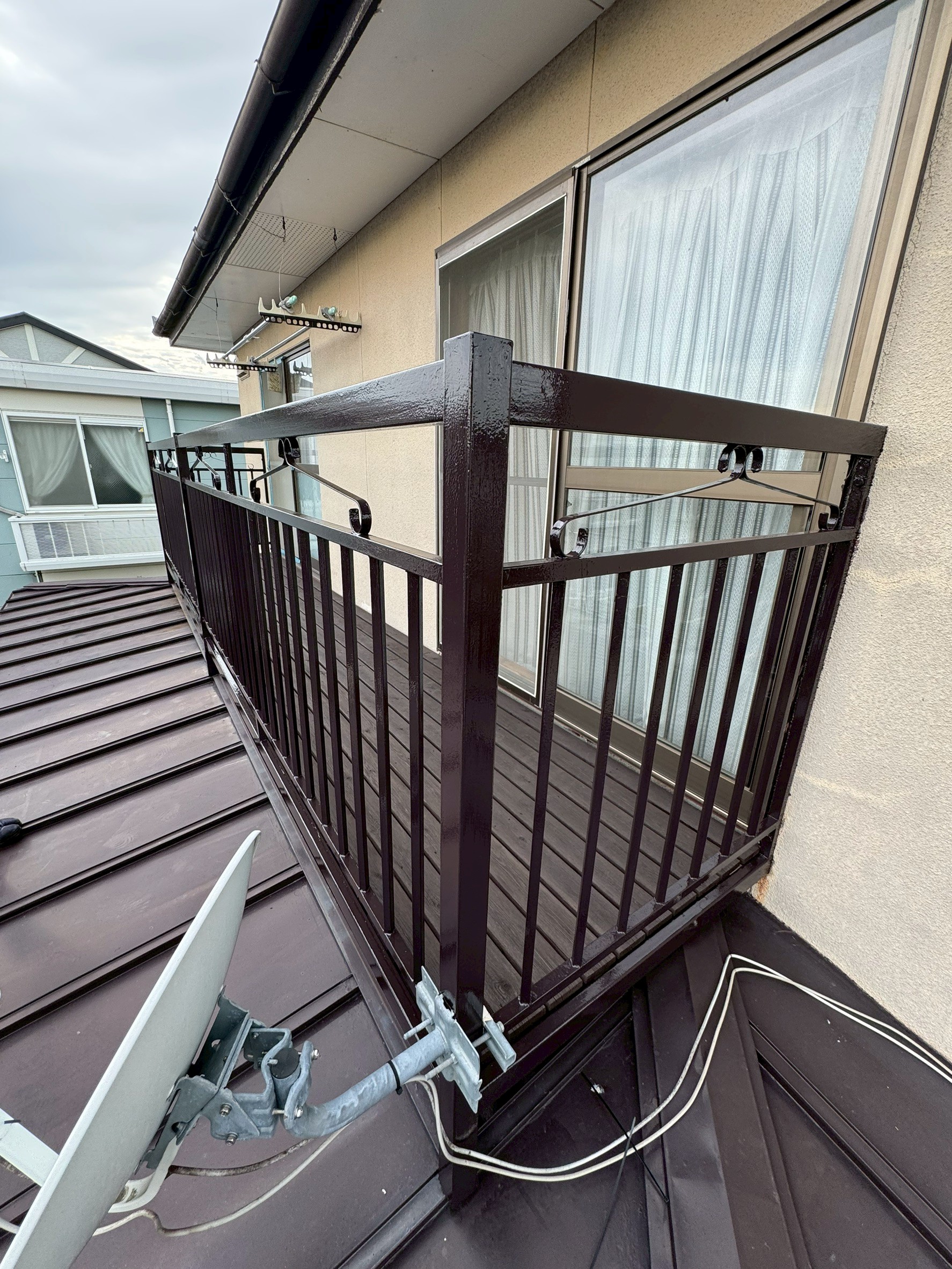 S様とは早いもので10年以上のお付き合いになりますね。これまでも外壁塗装やトイレのドア交換、ハクビシンの駆除など、様々なことをお任せいただきましたが、今回は貸家のベランダ塗装をご依頼いただきました。金属部分の錆がかなり進んでいましたので、今回お手入れをしておかなければ、将来的に丸ごと交換になっていたかもしれない状態でした。今回施工できて本当によかったです。
